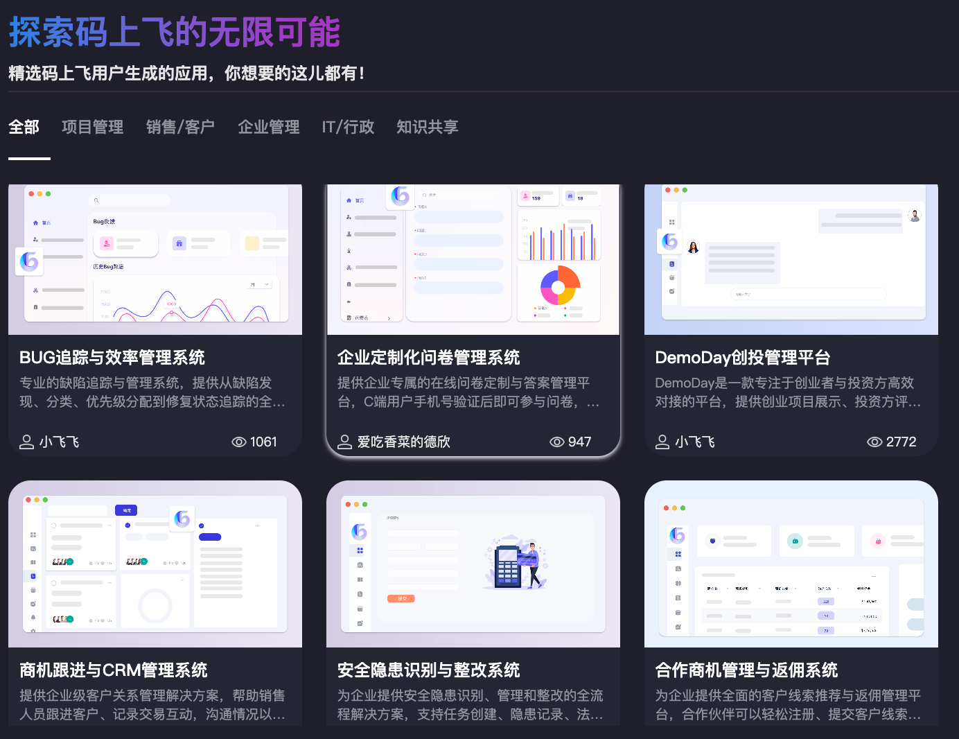 碼上飛是國內(nèi)首發(fā)的“文生軟件”平臺(tái),一句話生成1個(gè)APP。碼上飛能夠快速解析用戶發(fā)送的文字需求并直接生成出端到端的應(yīng)用程序和AI智能體應(yīng)用,供用戶在線預(yù)覽、體驗(yàn)以及修改。同時(shí)支持一鍵下載應(yīng)用的「桌面應(yīng)用安裝包」以及「應(yīng)用文檔及源代碼」甚至包括配套「計(jì)算機(jī)軟著申請(qǐng)材料」。